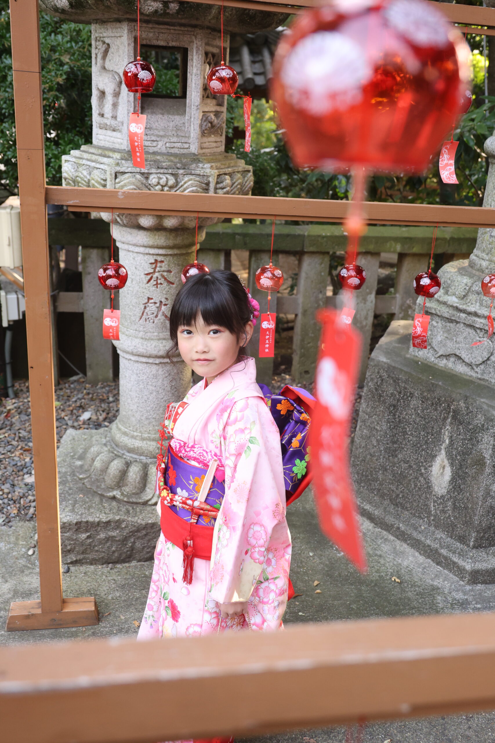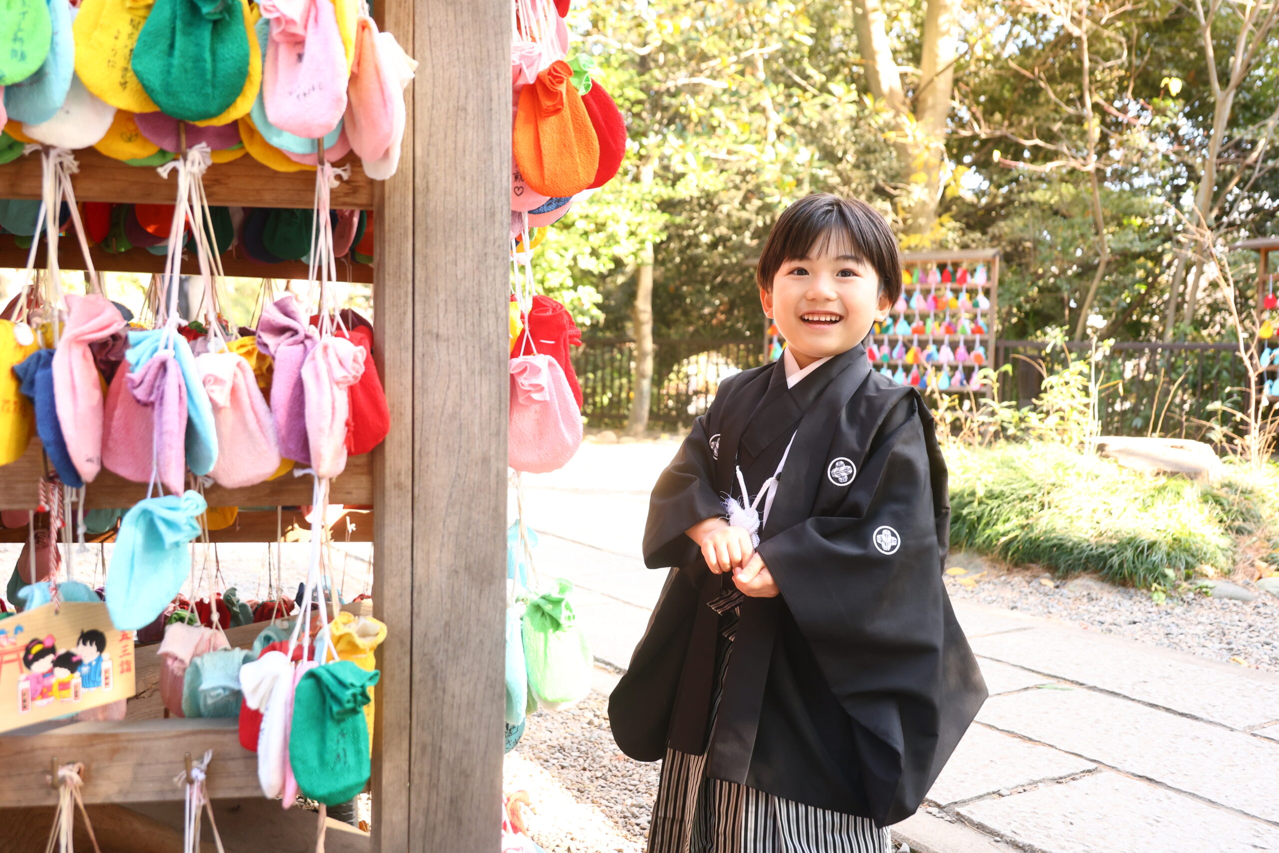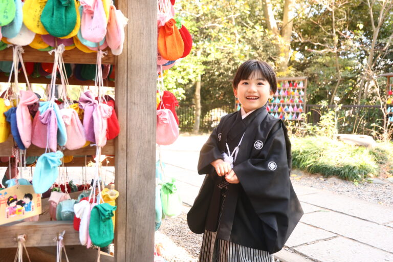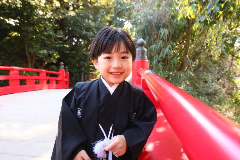 鳥居や石畳、境内の木々を背景に、和装姿のお子さまを撮影した作品です。 お参りの自然な流れの中で生まれた凛々しい表情、家族でそろった晴れ姿——スタジオでは演出できない、本物の七五三の空気感をご覧いただけます。